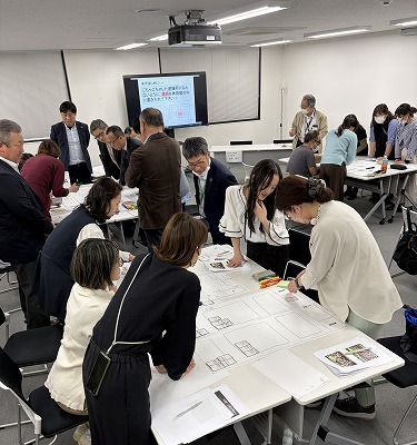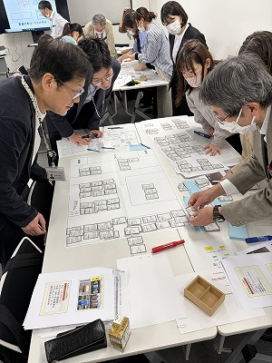 つぎにグループに分かれて「HUG(避難所運営ゲーム)」に挑戦しました。専用のカードを使用して、大地震などが発生した後に開設される避難所の様子を体験し、避難者が抱える事情を考慮しながら、避難所に見立てた平面図にどれだけ適切に配置できるか、またさまざまな出来事にどう対応していくかを模擬体験するゲームを、各チーム5~6人に分かれて体験しました。参加者からは「軽い気持ちで参加しましたが、防災減災への学びが深まった。他生協の世代が異なる方々とゲームを通して交流ができ、楽しかった」「より多くの人が体験してみるべき。町内会などでも取り上げて、日頃からこの体験ゲームを通してコミュニケーションをとっておくことも重要だと思った」などの感想がありました。