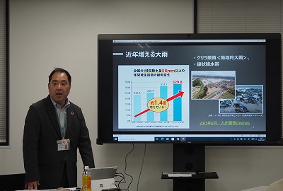 はじめに、「大雨・土砂災害からいのちを守る」と題して、こくみん共済coop・福家剛氏から講演があり、大雨や土砂災害に備えるための事前対策について話されました。ハザードマップの確認やキキクル※の活用に加え、「自分だけは大丈夫」と思い込んでしまう無意識のバイアス(正常性バイアス、同調性バイアス)を理解し、事前に避難の基準を決めておくこと、周囲に流されず、自分のいのちを守る行動を優先することで、自助を高め、結果として共助につながることなど、適切な避難行動の必要性について講演されました。参加者からは、「どこか他人事だった災害への意識が変わった」「キキクルのアプリを初めて知った」「自分が動くことで、周りの避難も促すという率先的な避難者の考え方は、大切な人のいのちを救う決断だと思った」などの感想がありました。